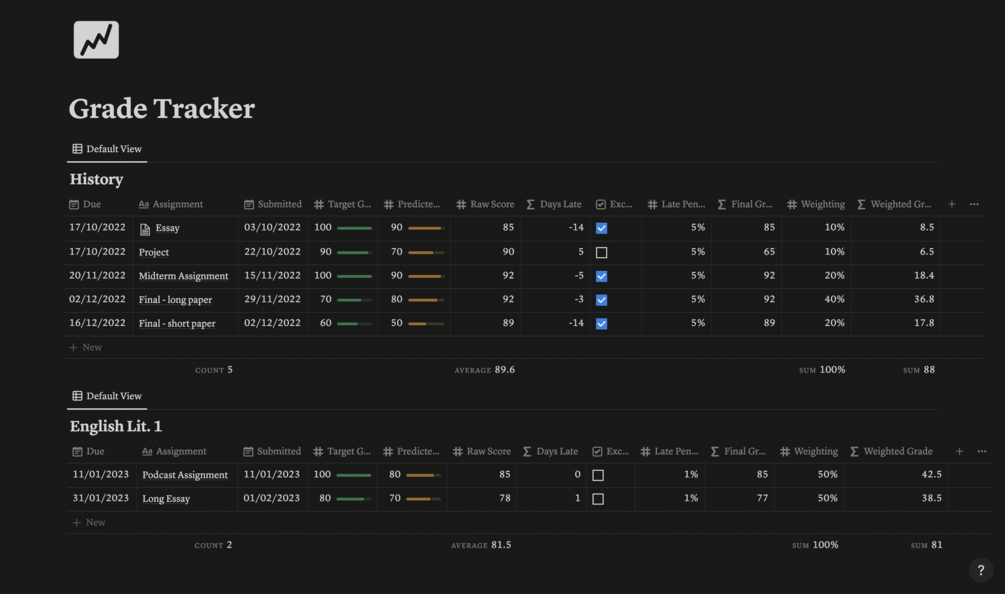 A detailed grade tracker where you can add your target grade and predicted grade and will calculate any late penalties and grade weightings for you.